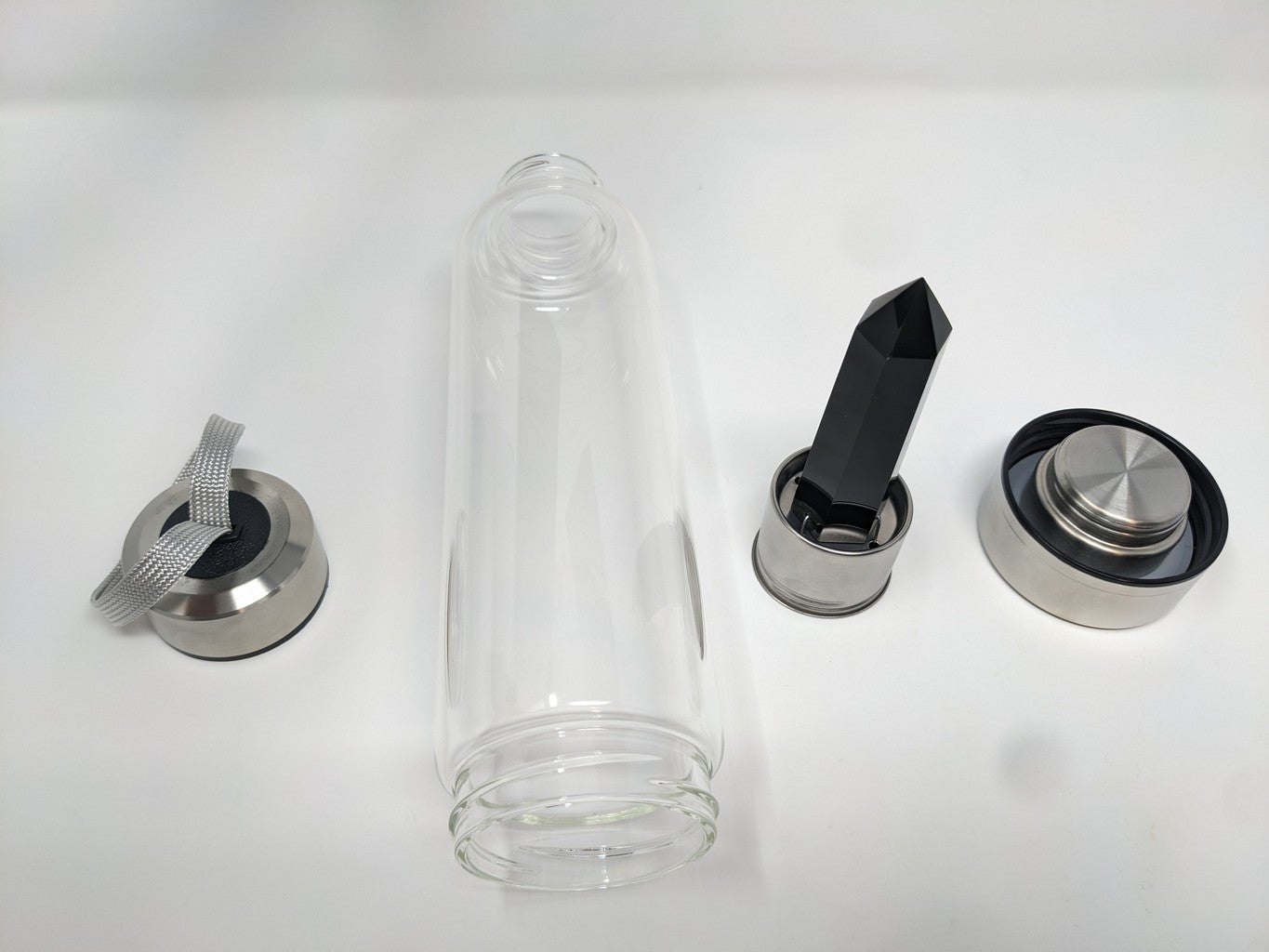 Water bottles are made from borosilicate glass which is more impact resistant than standard glass. It won't absorb flavors or odors, and won't impart a taste to your water. Bottle can be easily disassembled for cleaning. Rubber pad on the bottom for stability and a carry strap on the top lid.